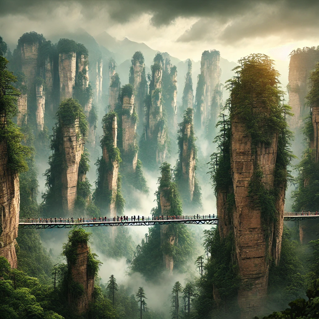 위 사진은 AI로 만든 장자제 산림공원의 기암봉과 유리다리의 장면입니다.